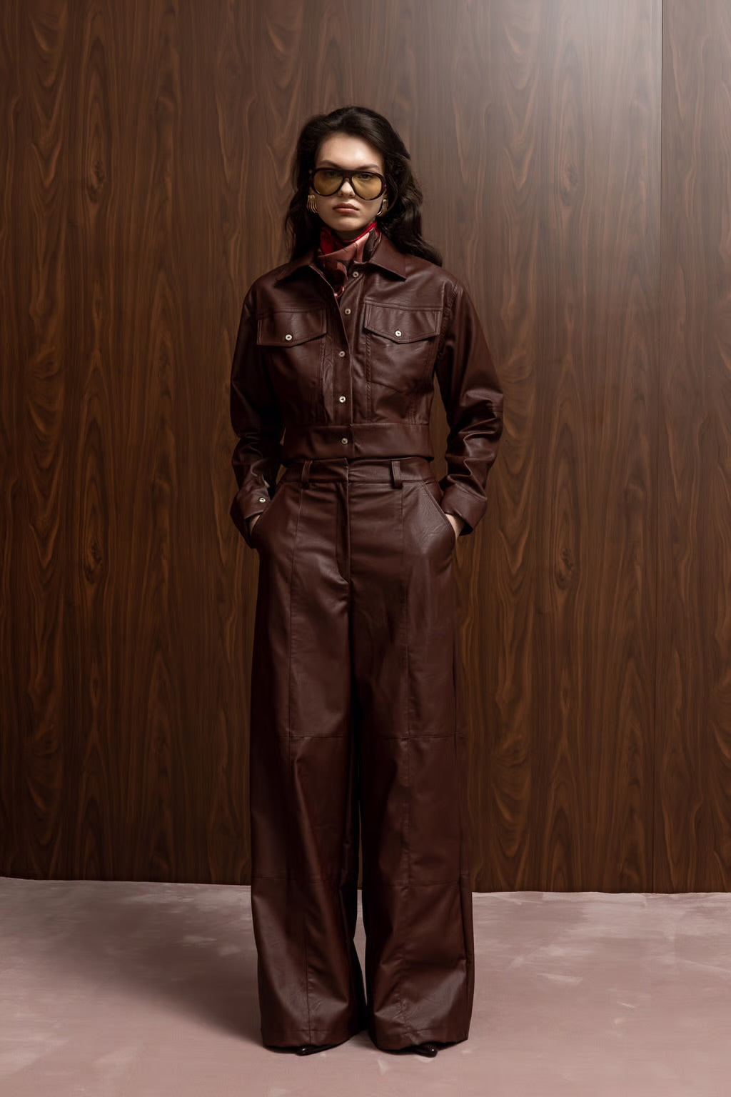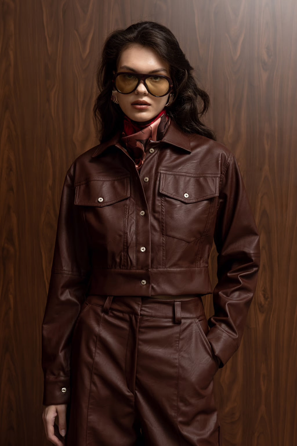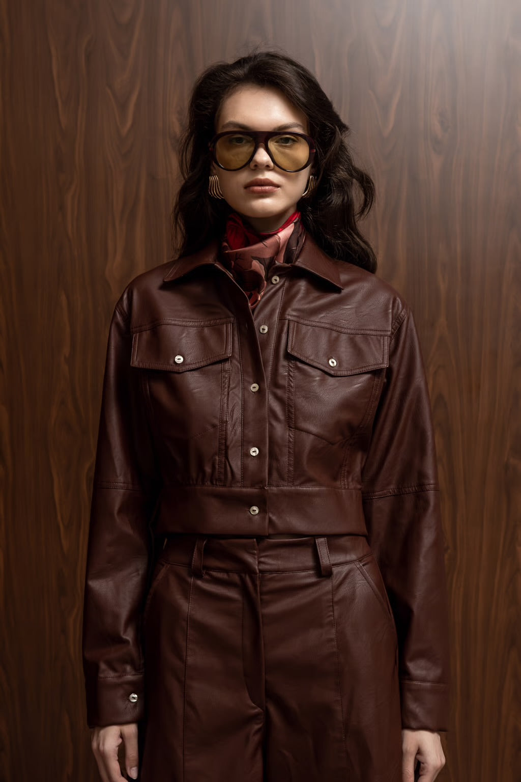 Κοντό δερματίνη shirt/jacket με βάτες και λεπτομέρειες με κουμπιά στα μανίκια. Διαθέτει δύο μεγάλες τσέπες δεξιά και αριστερά στο στήθος.