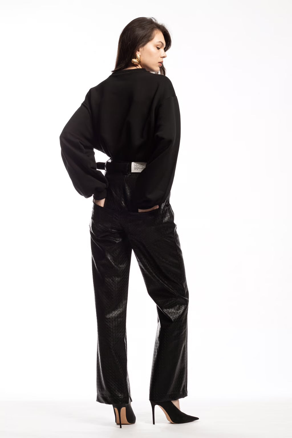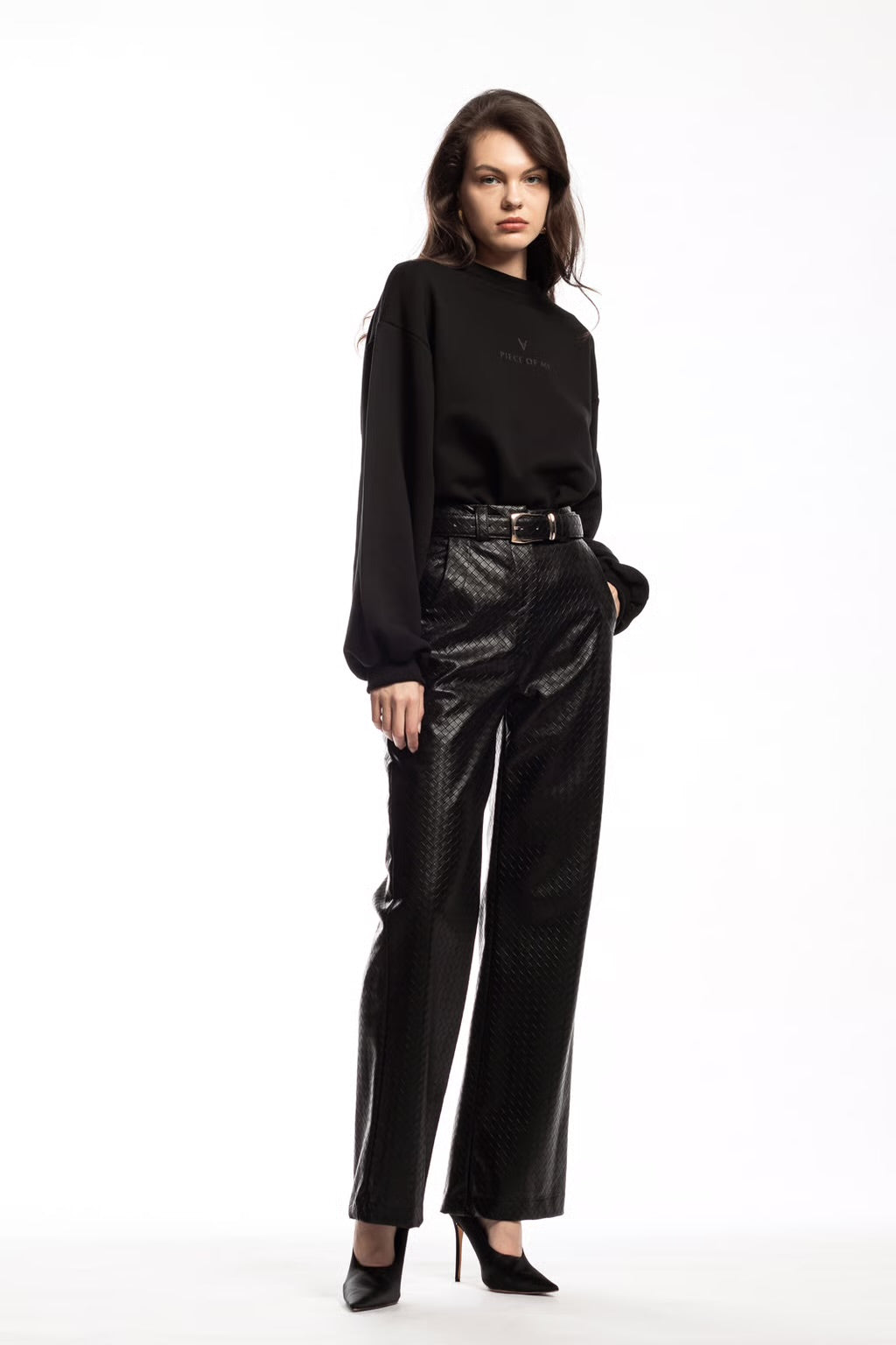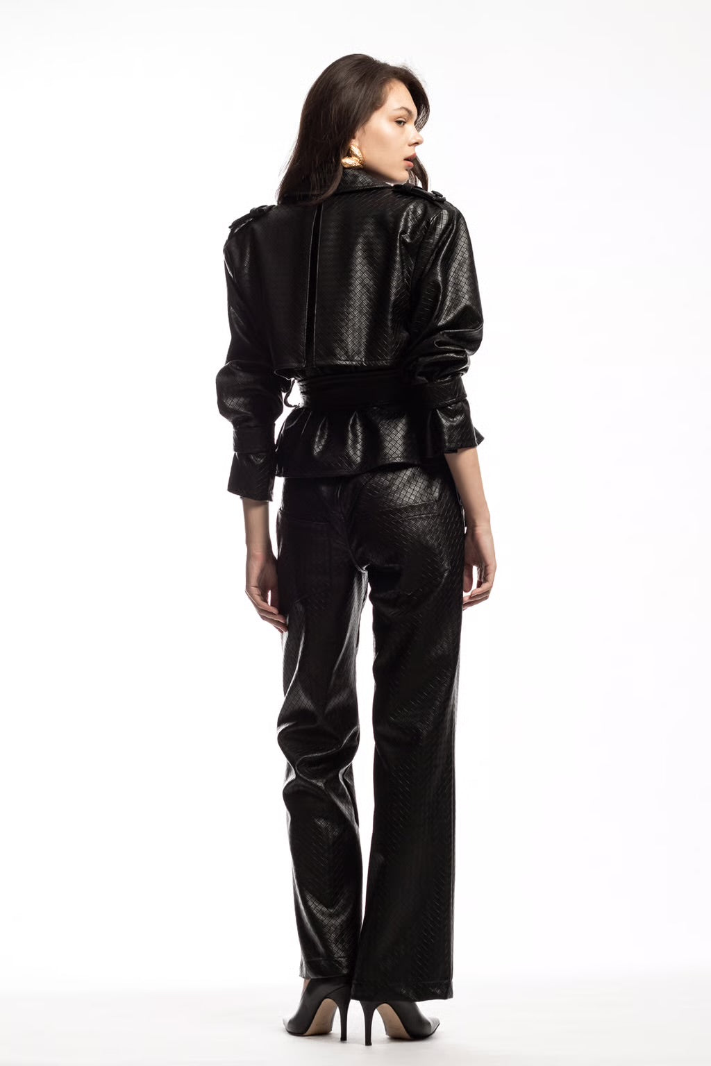 Παντελόνι με τεχνοτροπία στο ύφασμα σε ίσια γραμμή με τσέπες στο πλάι και πίσω. Κουμπώνει μπροστά και φερμουάρ