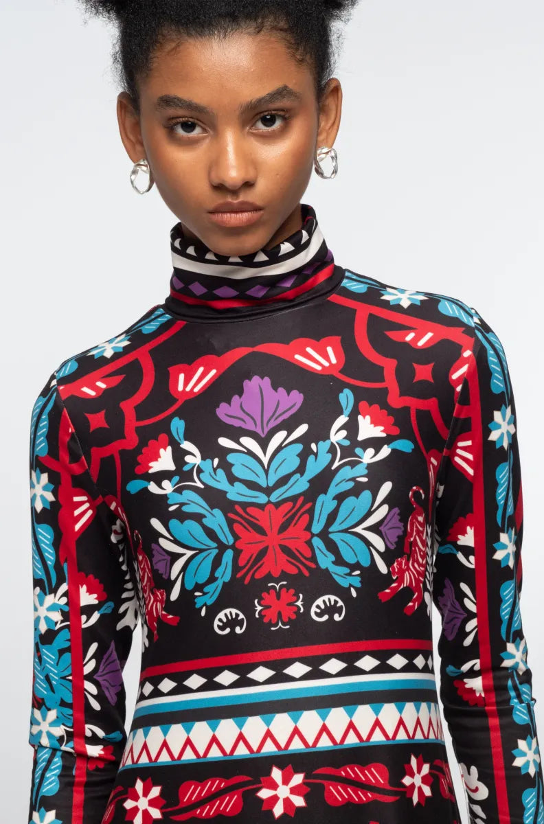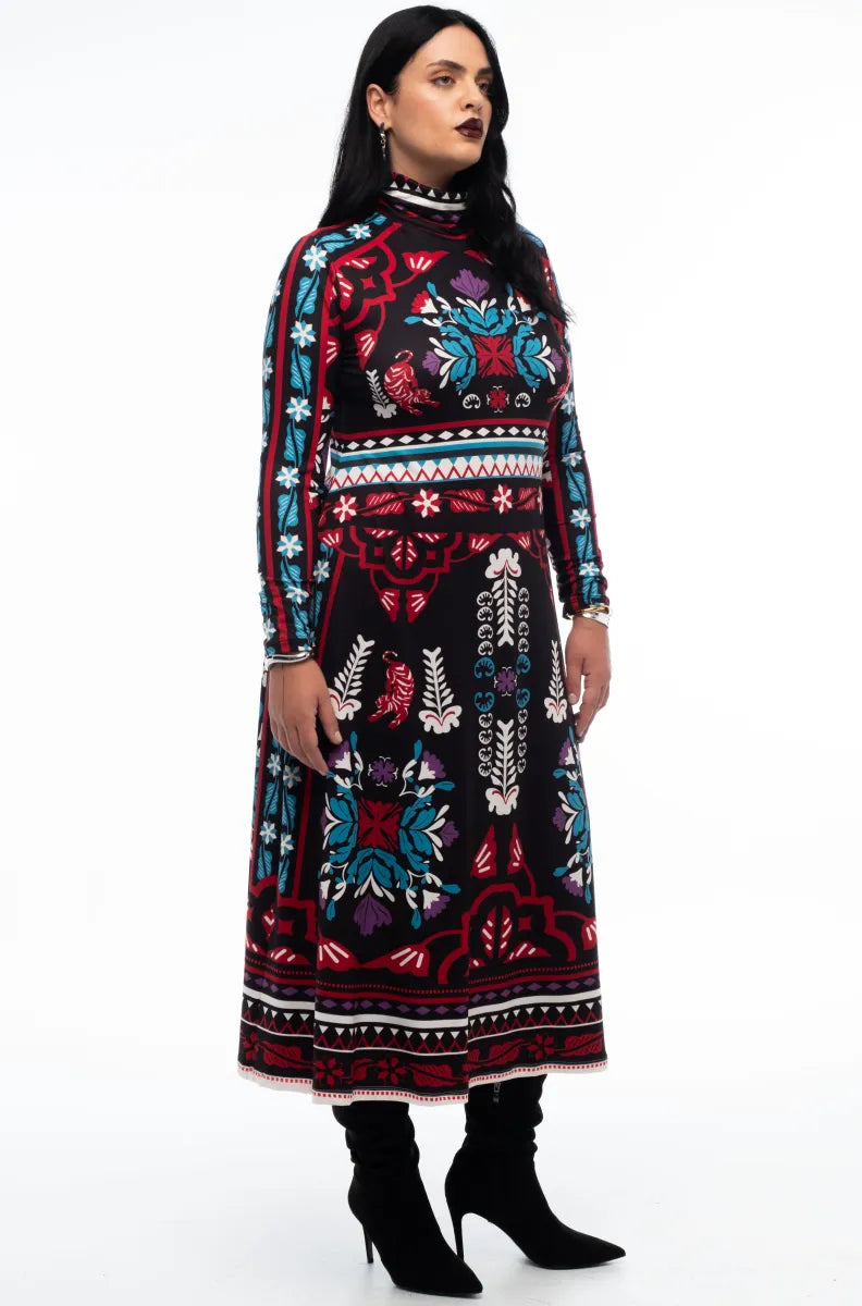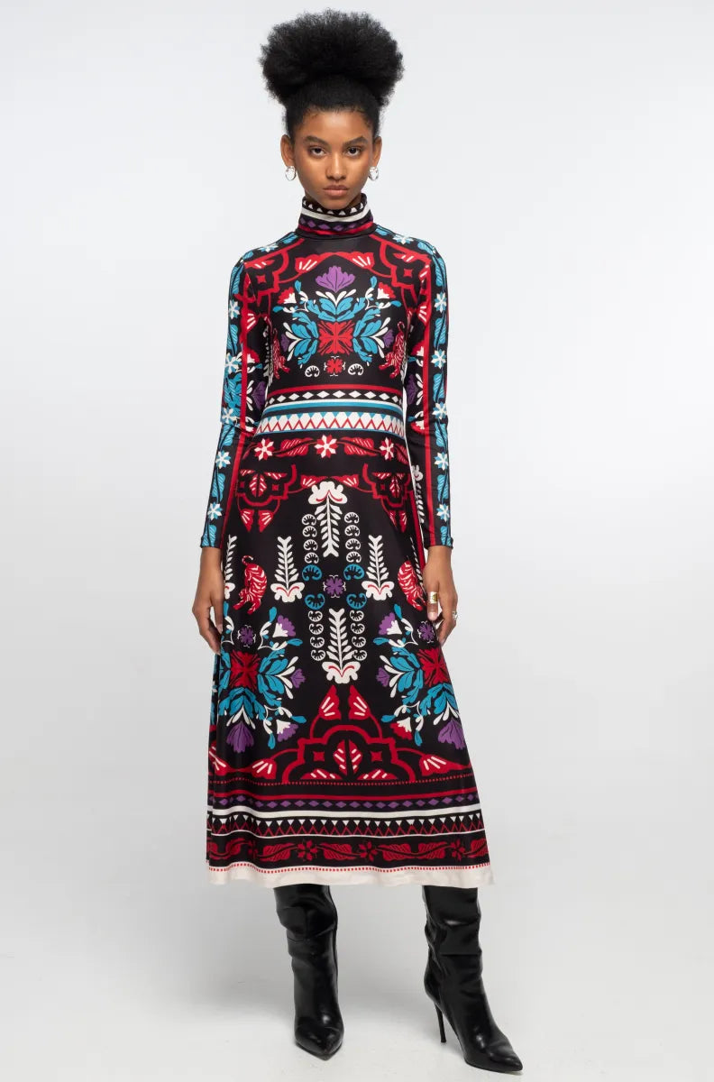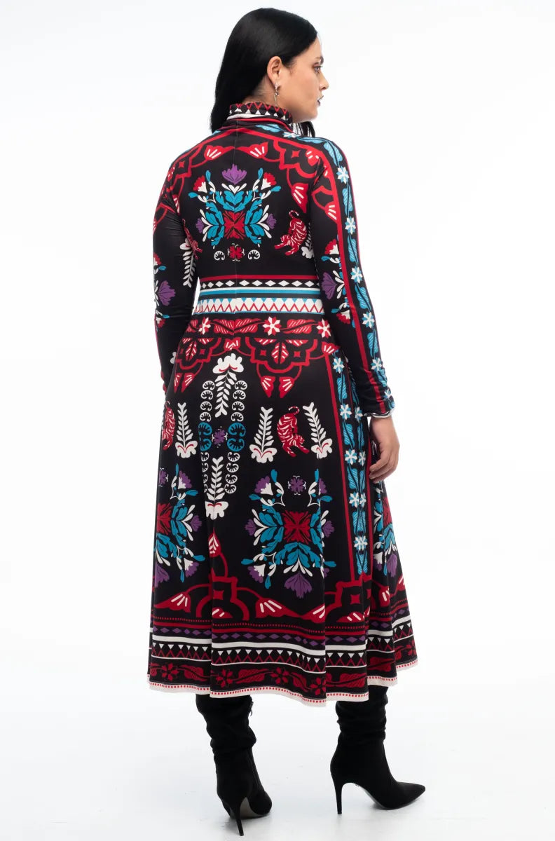 With a signature P+C A-line silhouette, our Mythical Long Dress features a turtleneck and cozy stretch fabric. The whimsical placement print accents the waist and evokes a colourful winter garden. A stylish choice for elevated day dressing or for event wear.