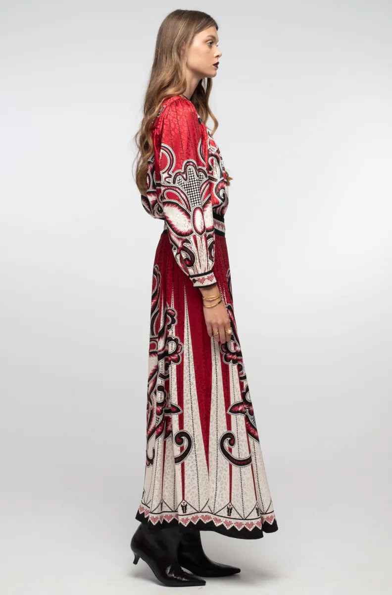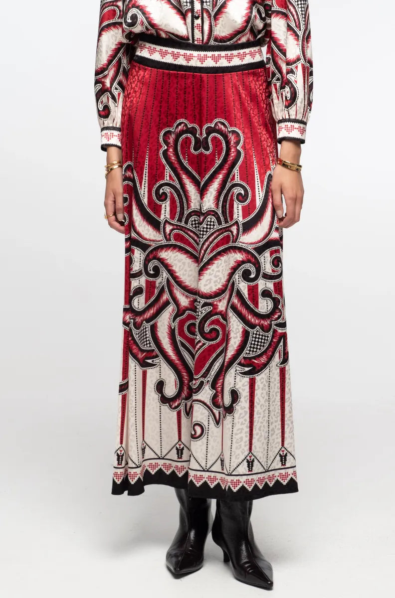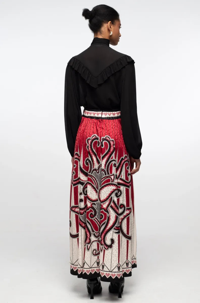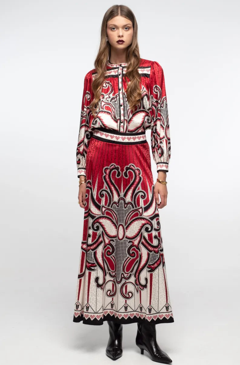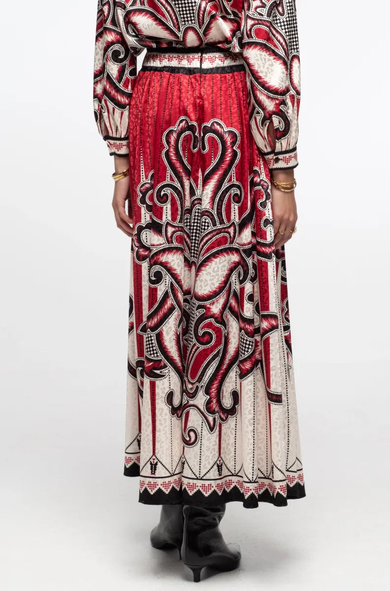Our Alchemy Long Skirt features a sophisticated red, black and ecru placement print and the subtle shimmer of leopard satin jacquard. This A-line skirt sits high on the waist with a smooth waistband, invisible zip and elastic band at the center back for a sleek fit. Wear yours with a matching Alchemy Shirt or a Copper Top in black for refined yet free-spirited vibes.