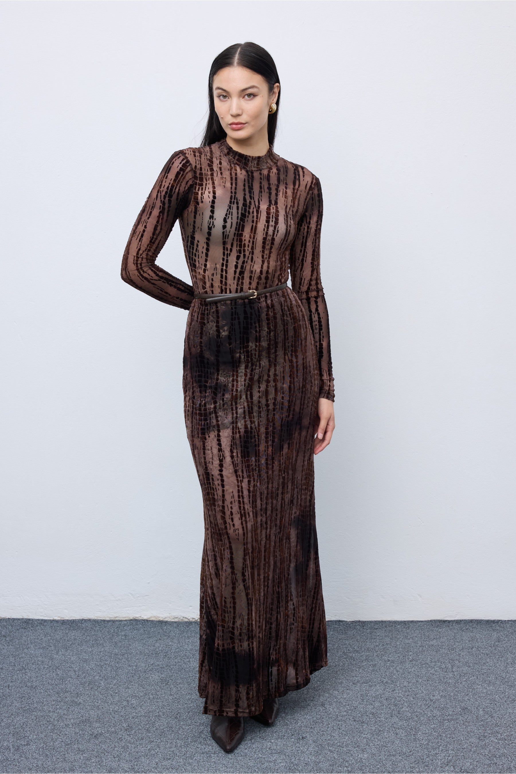 Elevate your look with the Second Skin Mesh Mermaid Skirt, a statement piece designed to flatter and flow. Made from the same luxurious stretch mesh as the matching dress, it features a stubtle ruched texture that enhances the body's natural shape while offering comfort and movement. The rich brown tie-dye effect adds depth and sophistication, making it a perfect piece for both casual and evening styling. Pair it with the matching bodysuit for a coordinated, contemporary look, or with a minimal top for effortless elegance.
