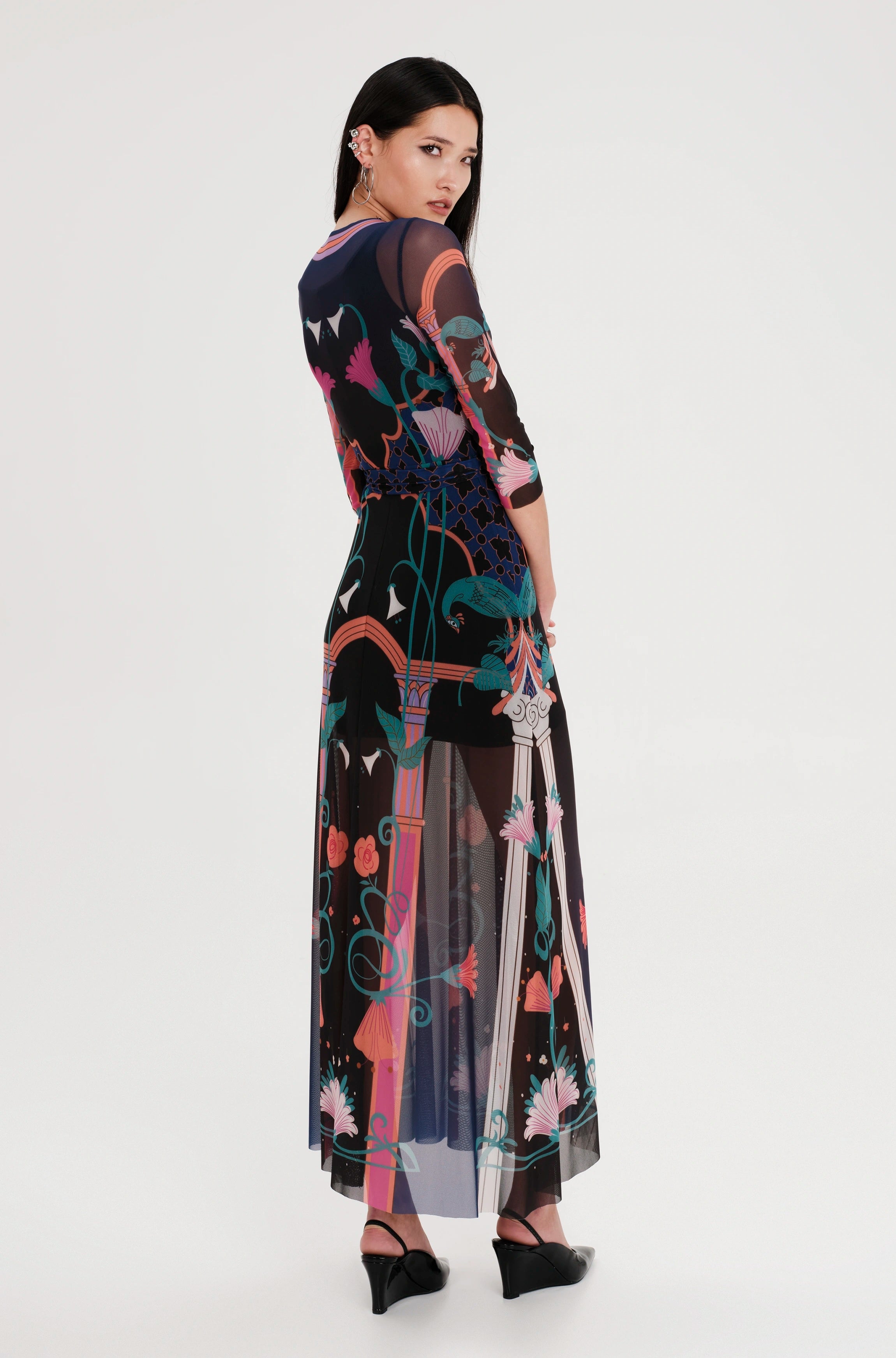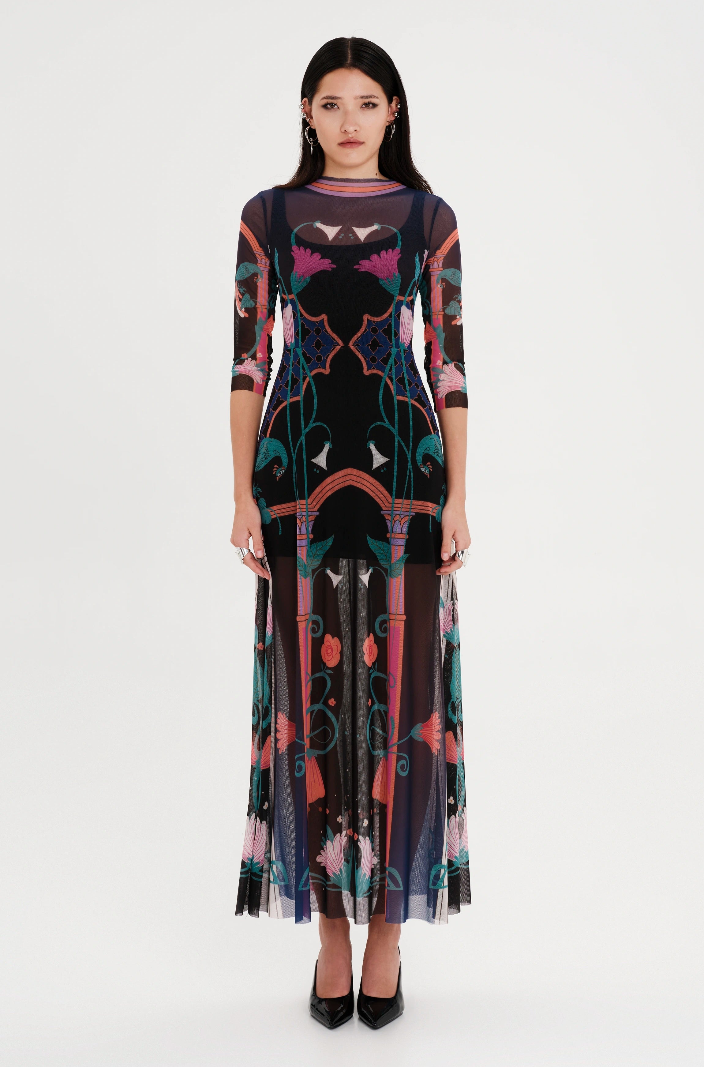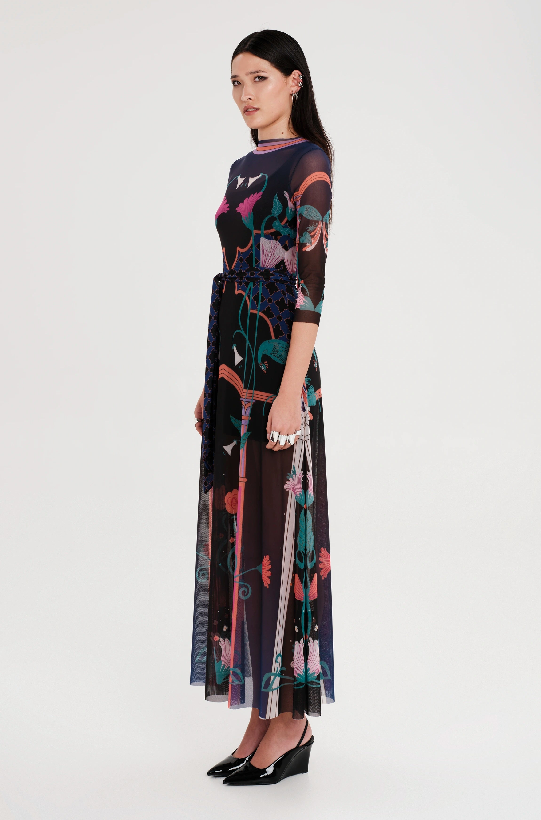 Elongating sleeves and a fitted A-line silhouette give our Epoque Long Dress refined energy. This soft stretch mesh dress has an opaque black jersey slip dress and features a placement print of vibrant Art Nouveau motifs on a subtle ombre background. Its matching belt can be worn for added definition or as a ribbon scarf tied at the neck for added flair.