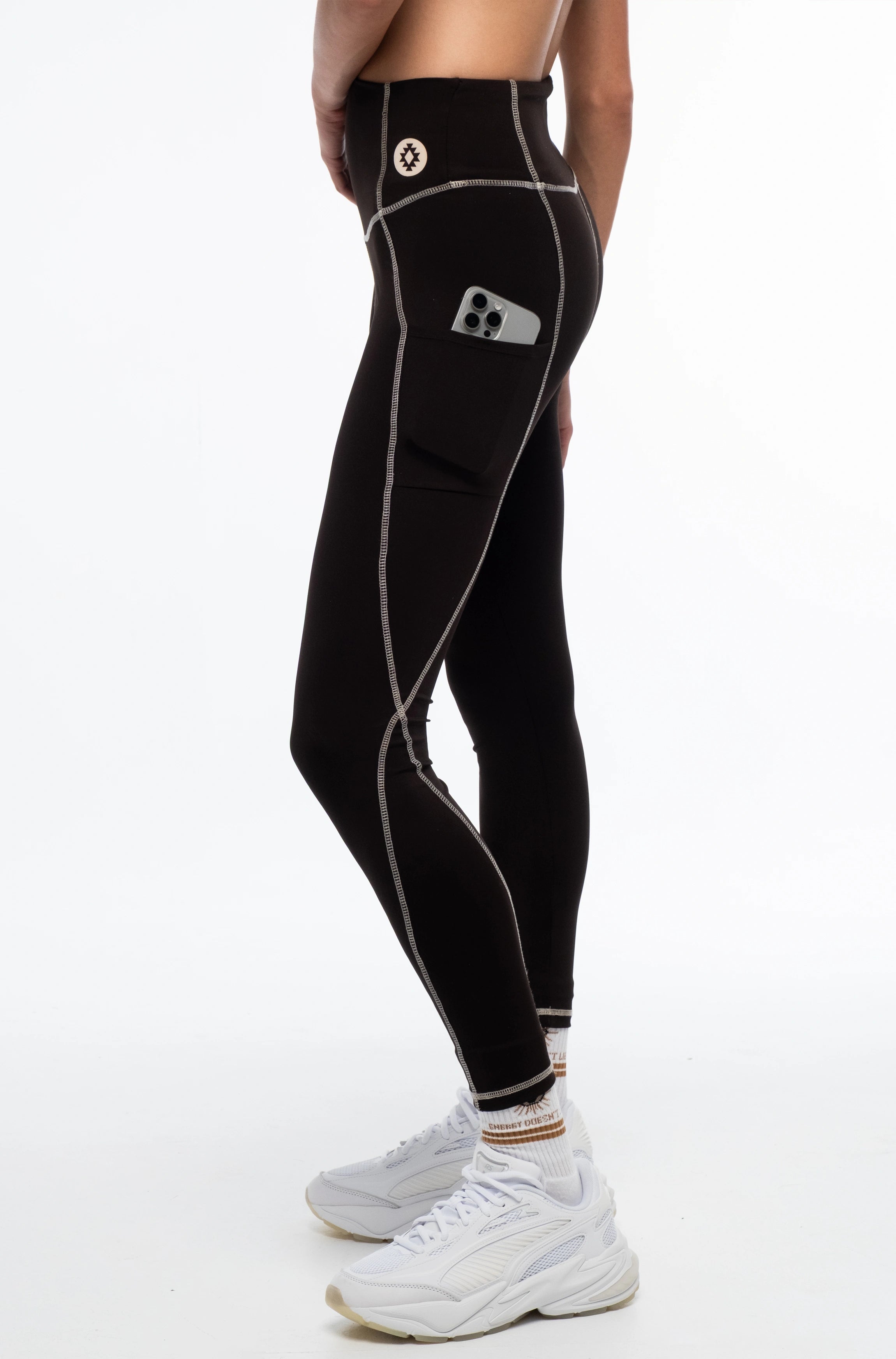 Our Panther Sports Leggings go with everything and can take you anywhere. Made from black stretch technical fabric, these high-rise, full-length leggings boast stylish details like contrasting white contour seams, a vinyl logo Chaka stamp and a thigh pocket. Try yours with a matching Panther Sports Top for a monochrome look and add a Sacred Wild Training Jacket for a pop of colour.